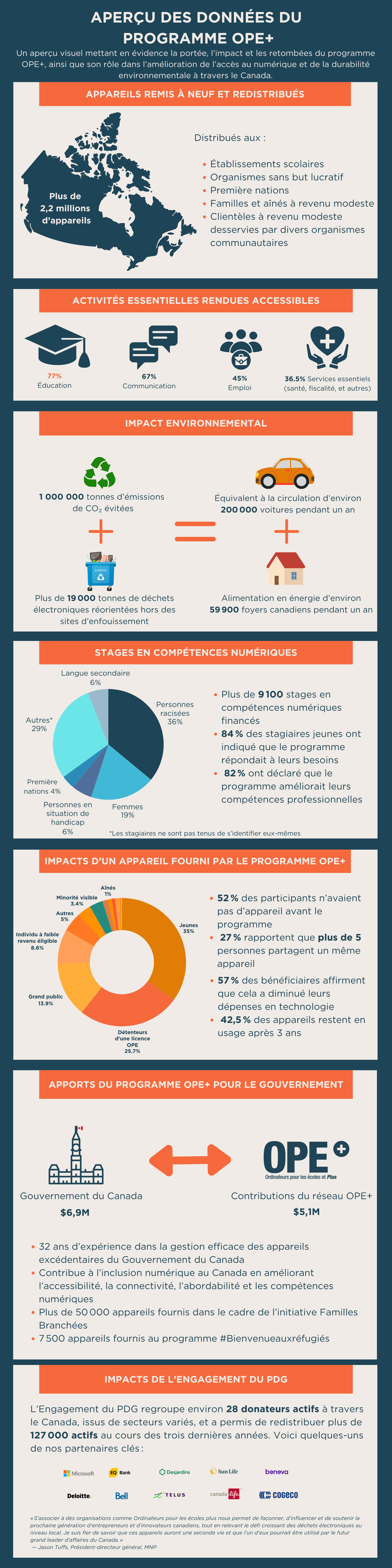 Un facteur clé du succès de OPE est l’initiative Engagement du PDG qui rassemble des partenaires corporatifs engagés envers l’équité numérique et la durabilité. Avec 28 donateurs actifs à travers le Canada, plus de 127 000 appareils ont été fournis au cours des trois dernières années.